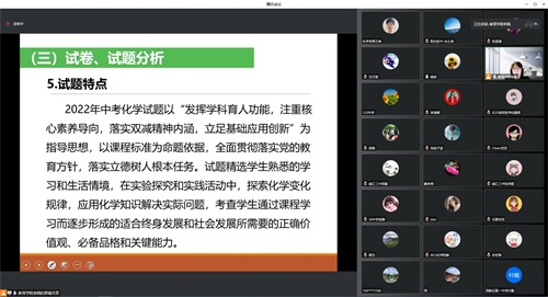 会上李娟老师对大连初中化学学科2022年中考质量做了专题分析报告,对2022年中考化学学科的命题思想、原则做以详细的阐述,并通过典型试题的分析,引导教师查找学科教学中的问题,充分发挥中考对学科教学的导向作用。与此同时,针对学生卷面出现的问题,分析教学误区和薄弱环节,提出进一步改进的策略和措施。