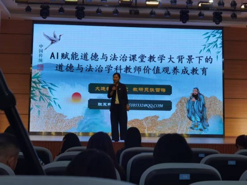 大连经济开发区滨海学校的王舒琳老师做了以《AI赋能道德与法治课堂教学大背景下的教学实践路径新探索》为题的分享;大连市初中道德与法治学科教研员以《AI赋能道德与法治课堂教学大背景下的道德与法治学科教师价值观养成教育》为题做了培训。