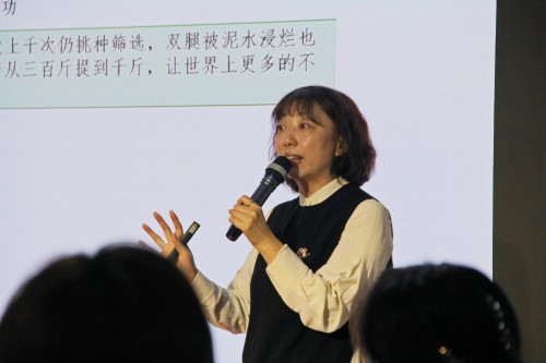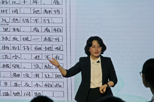 研讨以模拟考场、教师限时创作议论文开始,杨丹妮引导与会者思考,通过实践感悟议论文写作的真实障碍。大连经济技术开发区第九中学吴文超老师执教《议论要言之有据》写作课例,结合学生习作,分析论据修改策略及使用要求。随后,杨老师做了关于议论文写作的微讲座,阐释了AI助力议论文“论证说理”的课堂实施路径,为议论文写作教学提供了可落地的实践范式。