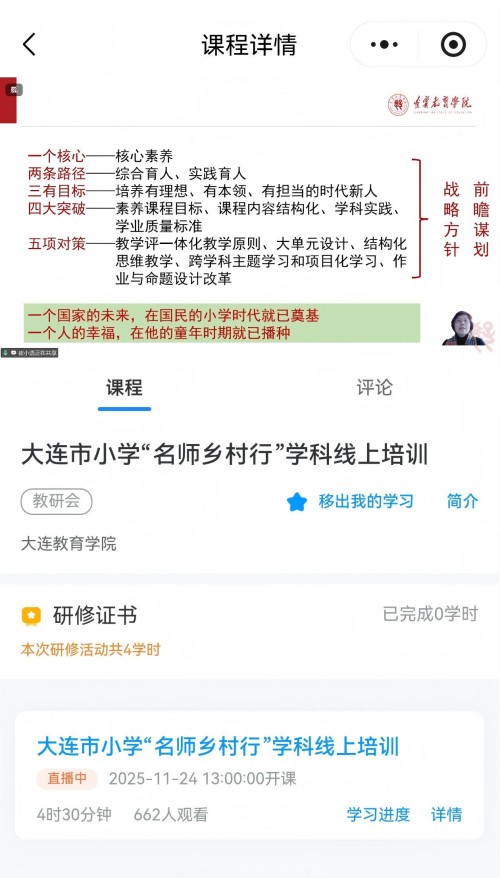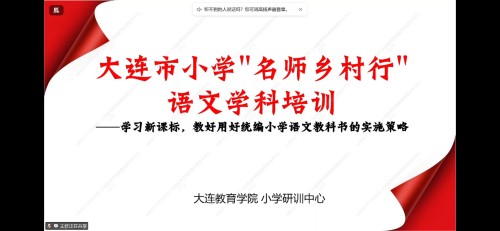 为大力推进我市国家级义务教育课程教学改革实验区建设,切实提升乡村教师新课程标准与新教材实施能力,依据《大连市小学“名师乡村行”送教送培活动》项目要求,11月24日,大连市小学语文“名师乡村行”开展了线上培训。