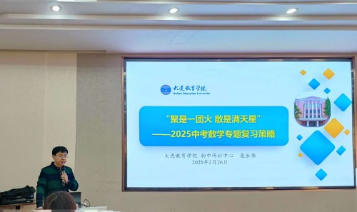 2月26日,大连教育学院初中研训中心数学研训教师栾长伟在大连市第七十六中学开展了以“‘聚是一团火散是满天星’——2025年中考备考策略”为主题的教研活动,全市八、九年级研训教师及市内五区教师共600人参加了此次活动。