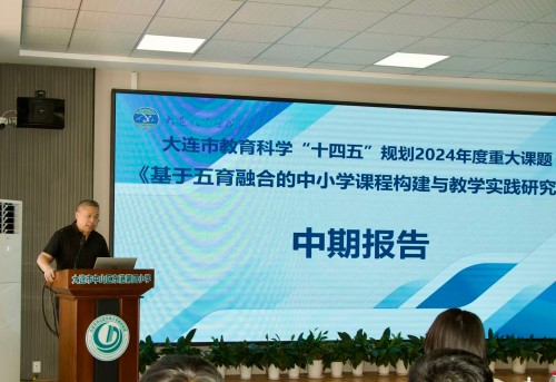 东港小学教育集团第四小学展示了学校“五育融合”特色课程,集团德育主任韩莹分享了学校“五育融合”实践经验。专项课题主持人代表、中山区教师进修学校于雯雯老师就专项课题研究作了中期汇报。重大课题主持人杨俊伟围绕“基于五育融合的学校特色建设”和“基于五育融合的音体美劳教学实践研究”两大主题内容作系统阐述,深入剖析了五育融合在课程构建中的实施路径与实践策略,强调以学生全面发展为核心,推动学科间协同育人机制建设,同时对下一阶段课题研究进行了部署。姜胜林高度评价了课题研究的阶段性成果,认为该课题立足育人本质,紧扣新时代教育发展脉搏,具有较强的前瞻性与实践价值,并对重大课题及专项课题的深化研究和成果转化提出了建设性意见。