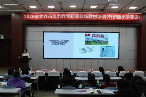 2月26日-27日,“2026年大连市义务教育新课标新教材培训(外研版小学英语)”在大连市沙河口区格致中学小学部举办。本次培训活动采取线上线下同步方式进行,市区400余名小学英语研训教师和小学英语教师参加现场活动,3000余名教师在线收看直播。在开幕式上,大连教育学院副院长赵妤婕为大会致辞,外研社基础教育出版分社社长张黎新讲话。