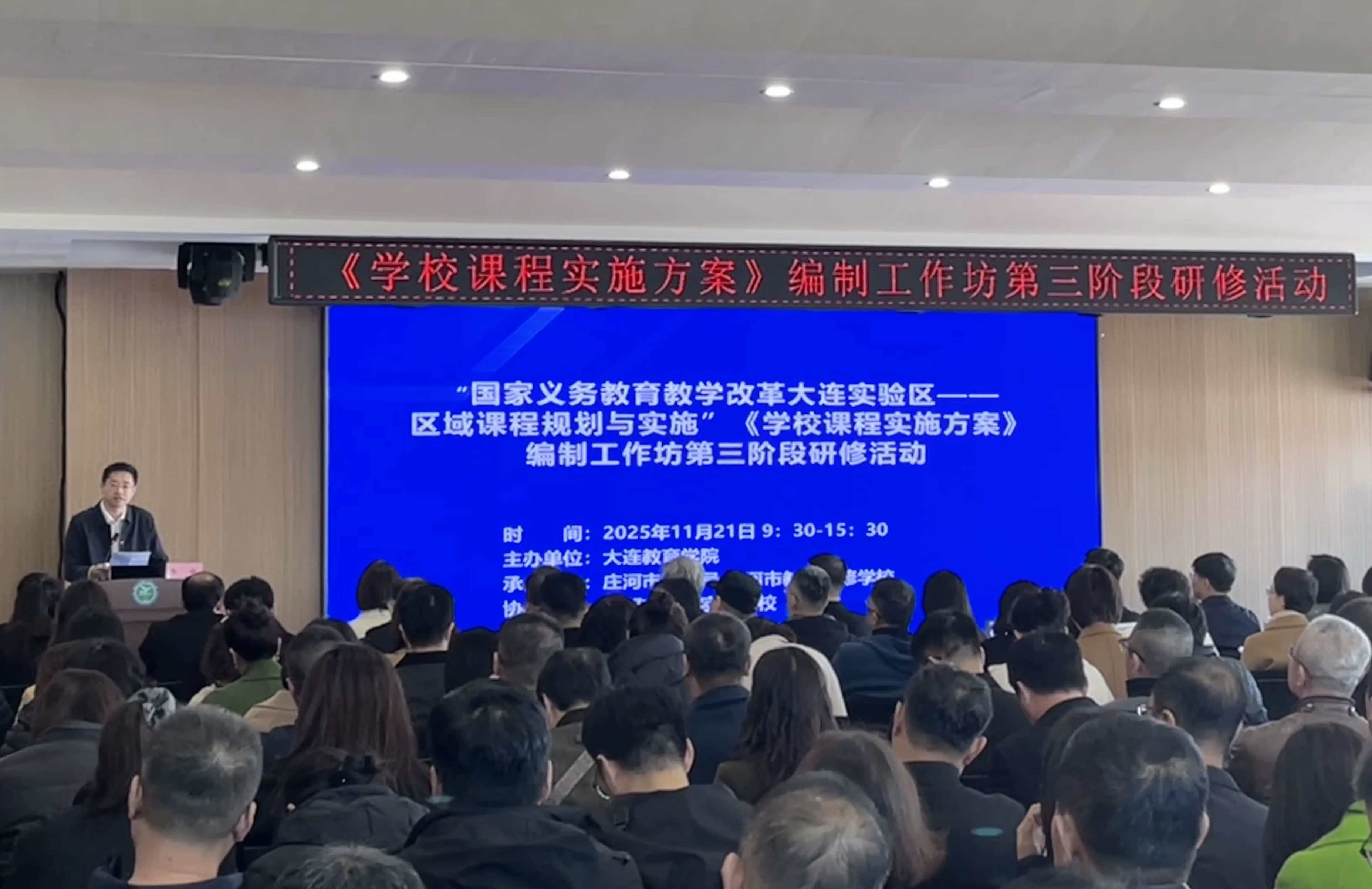 11月21日,由大连教育学院主办,庄河市教育局、庄河市教师进修学校承办,庄河市海华实验小学协办的“国家义务教育教学改革大连实验区——区域课程规划与实施”《学校课程实施方案》编制工作坊第三阶段研修活动在庄河市海华实验小学顺利举行。本次研修活动采取线上线下相结合的形式,聚焦学校课程实施方案的优化与落地,吸引了大连市各区市县(先导区)教师进修学校、中小学校、基地校的校长以及我市基础教育领军人才共同参与。