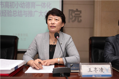 王冬凌院长总结了德育一体化典型经验总结与推广活动的六个阶段,"市区联动、覆盖面广、分类评审"的工作特点,以及本次活动中呈现的亮点,即学校重视德育课程体系建设、校园文化建设、各类德育活动开展、学校家庭社会协同育人;剖析了学校德育工作在区域德育一体化建设、学段和年级间德育一体化、学科德育渗透三个方面存在的问题;指出了区域德育一体化工作努力的方向,即进一步提高认识,处理好学生身心发展连续性和阶段性相统一的关系,构建学段间、年级间相互衔接的德育目标体系和内容体系,处理好德育专门途径和课堂教学基本途径、课堂教学主渠道和教育全过程的关系,加强德育工作研究,进一步增强德育工作设计的系统性、德育工作实践的针对性。