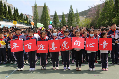 在鲜红的党旗下,在艳丽的紫藤花下,王迎春校长带领全体同学宣誓:不忘初心,童心向党,心系祖国,热爱人民!