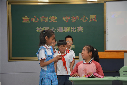 因初次尝试比赛,学校在前期做足了功课。在全体教师会上进行专题培训,从什么是校园心理剧,他和课本剧有什么区别?怎样撰写心理剧本,从哪些心理方面着手?等方面进行专题培训。各班级结合学生实际,确定主题,撰写剧本。从学习、认知、情绪、网瘾、青春期心理等方面搜集素材进行创作改编。选择学习方面的心理剧如四年四班的《学习是自己的事情》,四年六班的《试卷风波》,三年一班的《差生的作业》等;选择情绪方面的心理剧如三年五班的《心灵的抚慰》,四年二版的《送你一颗心》,五年二班的《阳光少年》,六年五班的《起起伏伏人生》等。选择人际方面的心理剧如六年四班的《杜绝攀比从我做起》,五年三班的《让爱传出去》等。反映网络方面的心理剧如六年三班的《手机游戏风波》。青春期心理方面的心理剧如六年二班的《叛逆的青春》,生活方面的心理剧如五年四班的《远离校园霸陵》等。人物的设定、剧情的安排,逻辑性强。主题明确新颖,有教育、启示意义,适合学生表演。