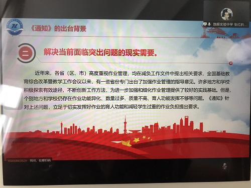 会议内容由共同学习政策文件、分享前言文献、实践探索引领和总结分析指导四部分组成。大连旅顺实验学校张红老师、大连开发区滨海学校吴佳慧老师、大连开发区七中卢海玉老师、大连第七十六中学尹楠楠老师、大连第七中学王艳侠老师和大连第三十三中学张永阁老师作为教学代表从不同方面结合自己的学习体会和教学实践经验在会上做了精彩的分享。大连教育学院初中英语教研员刘敬雯老师最后做了总结发言,刘老师针对征集的来自全市161所学校的300余份作业布置样例进行了全市作业布置现状汇报,分析了共性特点、主要问题并提出了新学期的教学建议。此次会议结束后,要求各校教研组长和备课组长带领本校老师进一步学习文件精神,通过分析本校作业布置现状、学习借鉴他人的优秀成果进行作业设计改进,并在两周内再次提交作业改进样例供全市教师再次研讨。