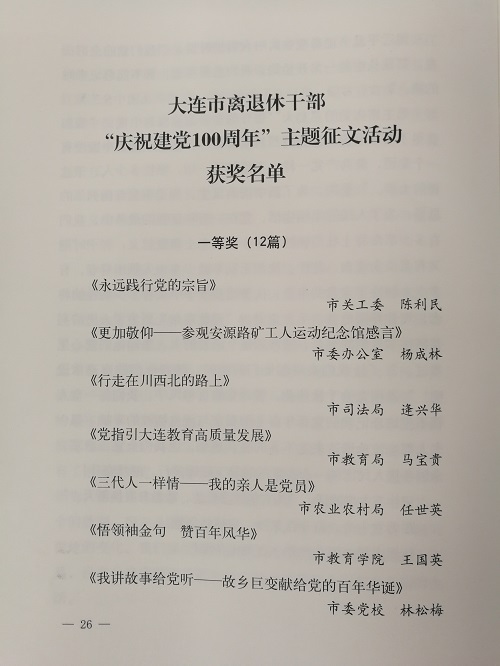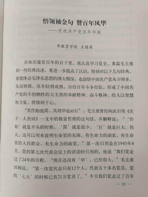 为迎接党的百年华诞,市委老干部局在全市离退休干部中开展了"伟业铸辉煌·颂歌献给党"庆祝建党100周年征文活动。全市广大老干部积极响应、热情参与,用心创作了600余篇征文,经市委老干部局评审,评选了60篇优秀作品(其中一等奖12篇)。学院退休教授王国英撰写的《悟领袖金句赞百年风华》一文脱颖而出,被评为一等奖。