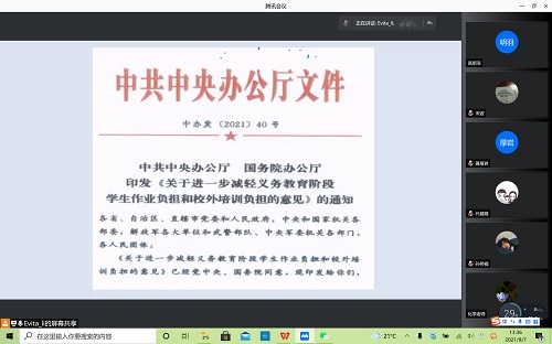在本次活动中,李娟老师带领老师们针对"中共中央办公厅国务院办公厅印发《关于进一步减轻义务教育阶段学生作业负担和校外培训负担的意见》"进行了学习和解读。