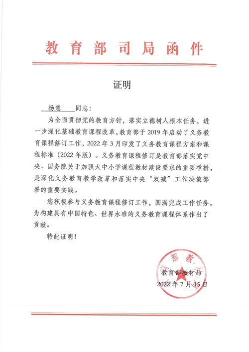 杨慧老师圆满完成本次课标修订工作,是其个人求真的学术态度和卓越的科研能力的最佳体现,也是学院多年如一日深研笃行、研训一体的工作理念的具体落实。