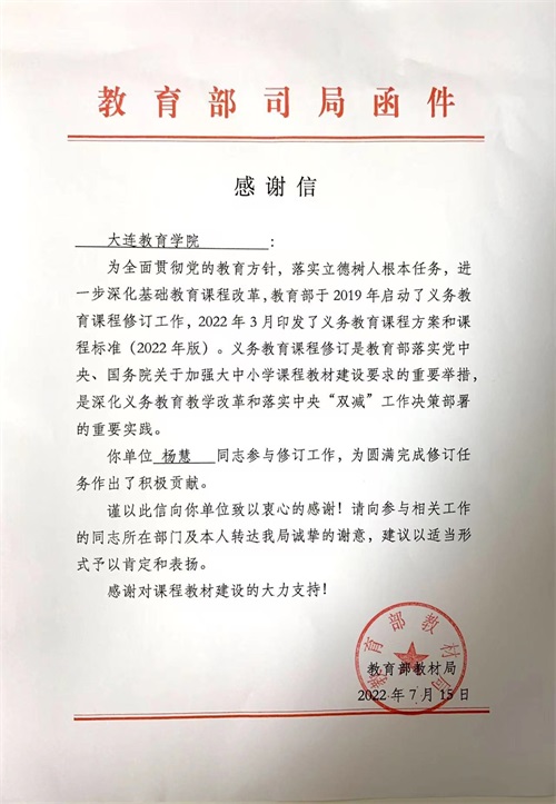 这封盖着鲜明红戳的信函,以郑重诚挚的语言高度赞扬了我院杨慧老师在历时三年的最新版义务教育课程方案和课程标准修订工作中的积极作为和重要贡献。这是杨慧老师在其教研生涯中的珍贵际遇,也是大连教育学院收获的宝贵殊荣!
