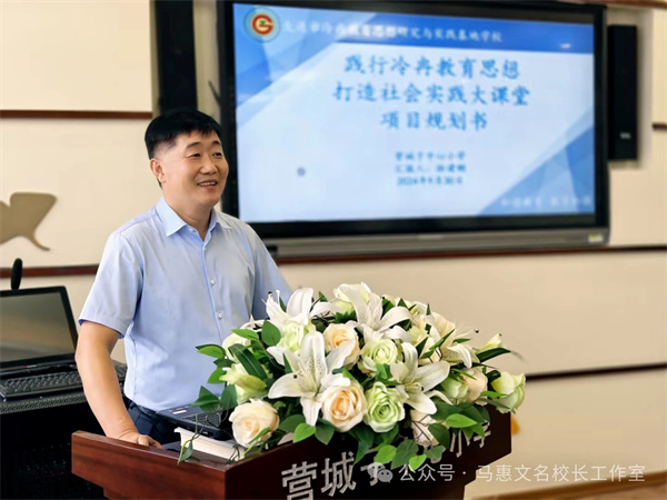 首先,营城子中心小学校园文化宣讲员们带领专家和校长们参观了学校的校园文化。随后,营城子中心小学校长孙建刚具体汇报了学校基于冷冉教育思想开展实践教育项目的研究经验。孙校长着重分享了营城子中心小学基于冷冉"德育过程阶段说",整合可利用的社会教育资源,根据学生在不同学习阶段的需求,分学段设计社会实践活动内容,构建并实施学校社会实践大课堂课程体系;探索社会实践大课堂有效实施的途径与方法;构建社会实践大课堂评价体系等做法。