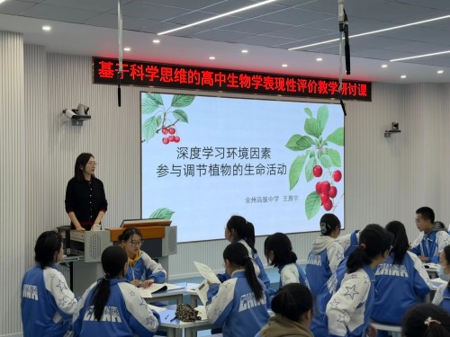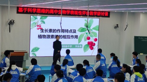老师们首先观摩了两节基于科学思维表现性评价的一轮复习展示课。第一节课基于樱桃育苗和樱桃管理创设情境,复习了生长素的作用特点和植物激素间的相互作用;第二节课以樱的桃生长发育为情境,通过阐释光照条件下基因调控ABA合成和花青素积累的相互关系,总结植物生长发育的整体调控概念模型。两位老师基于真实科研背景,以任务为依托,引导学生建构必备知识体系,设计实验,并结合量表在相应环节使用,落实生物学学科核心素养的培育。