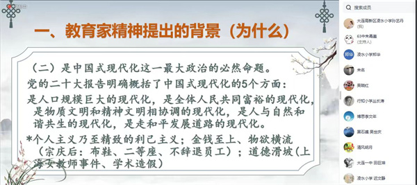 赵教授的精彩报告,让大家对教育家精神有了更深的感触。工作室成员在线上展开了热烈的讨论,大家一致表示要全面贯彻两会重要指示,以教育家精神为导向,立足各校实际办学情况,推动特色发展,培养"四有好老师",当好"四个引路人",培育更多有理想、有本领、有担当的新时代好少年。