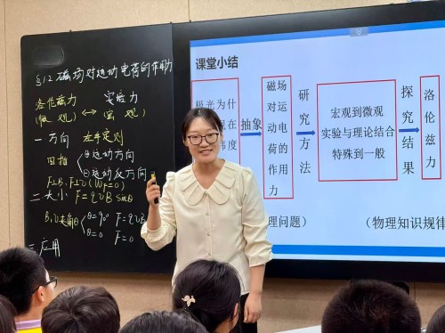 大连第八中学王雅丽老师的讲座对磁场部分教材做了详细分析,梳理教材内容,给出教学建议,在难点处用AI制作动画,展示带电粒子在电磁场中运动,突破难点,帮助学生建构物理模型。