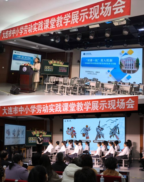 会上,大连教育学院艺体劳研训中心初中劳动和综合实践教研员胡晓华老师做了题为《‘双课一统’育人机制——区域推进劳动实践高质量发展的探索与实践》的主旨报告,对大连市劳动实践课程改革的特色品牌“双课一统育人机制”进行了系统的梳理和阐释。嘉汇阳光学校王秋娜老师现场执教了《光影传奇——走进皮影戏的千年世界》一课。