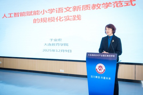大连教育学院院长赵刚主持会议。他强调,本次会议锚定人工智能与语文教育深度融合主题,以核心素养培育破解传统教育痛点,为构建育人新生态提供了创新路径。大连教育学院小学研训中心主任于业宏在会上作《人工智能赋能小学语文新质教学范式的规模化实践》主旨报告,系统阐述了该范式的核心内涵:以学生发展为根本,以核心素养培育为导向,以人工智能技术为关键引擎,通过深度人机协同与精准数据驱动,重构语文教学的“教、学、评、研、育、管”全要素闭环体系,最终实现规模化因材施教与立德树人目标的深度高效融合,构建了可复制、可推广的“全学段-全要素-新模式”实践体系。