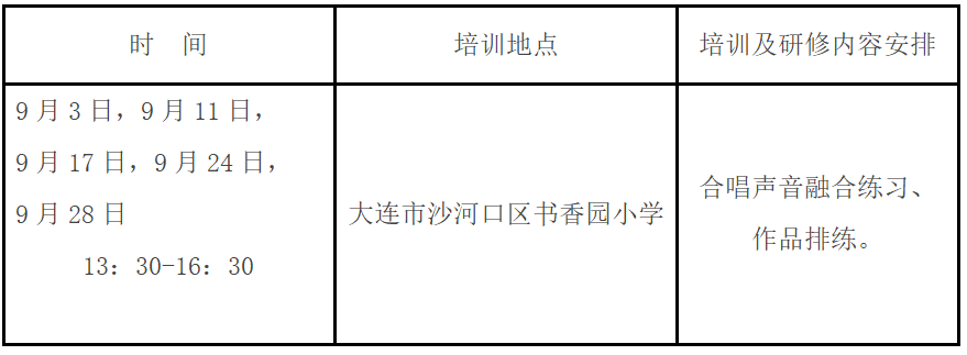 为贯彻落实《教育部关于全面实施学校美育浸润行动的通知》和《辽宁省全面实施学校美育浸润行动工作方案》精神,进一步落实立德树人的根本任务,提高音乐教师专业素养和教育教学能力,提升音乐教育研究和课堂教学质量,提高学生的审美及人文素养,大连教育学院艺体劳研训中心拟于2025年9月继续举办义务教育音乐教师合唱教学能力提升专项培训。
