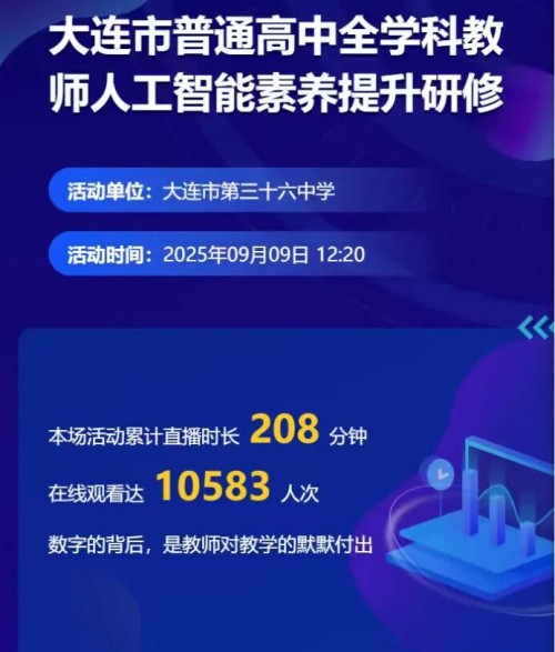 近日,“大连市普通高中全学科教师人工智能素养提升研修活动”在大连市第三十六中学圆满举办。大连教育学院副院长赵妤婕出席活动并致辞。本次活动由大连教育学院主办,采用线下与线上相结合的研修模式,吸引了超1万人次在线观看。