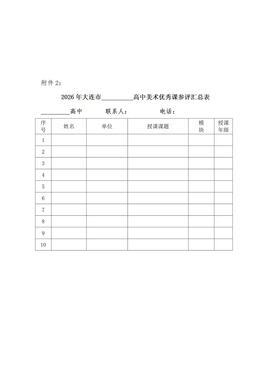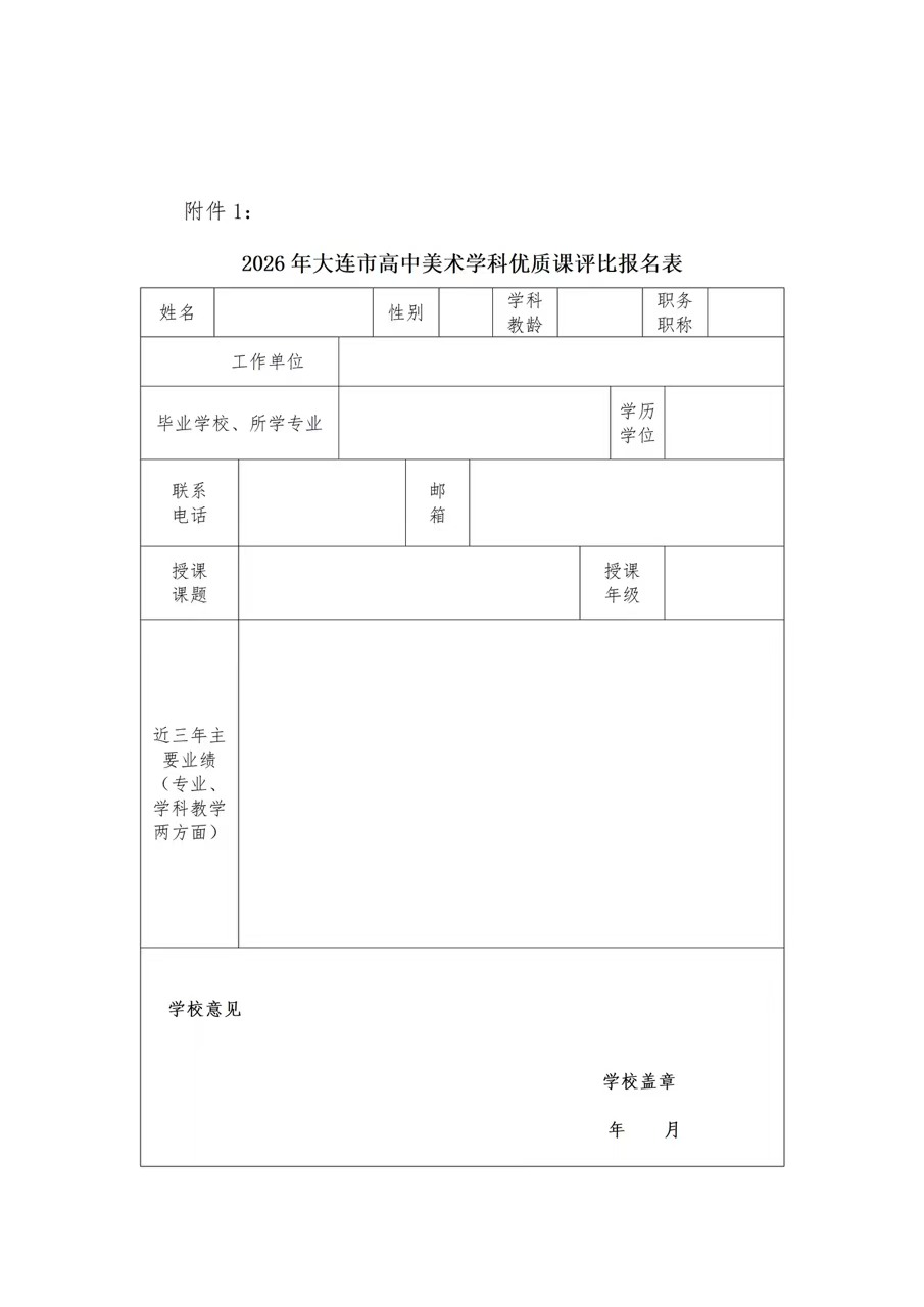 1.参评老师需填写“2026年大连市高中美术学科优质课评比报名表”(附件1),须加盖学校公章,拍照或扫描成图片文件。