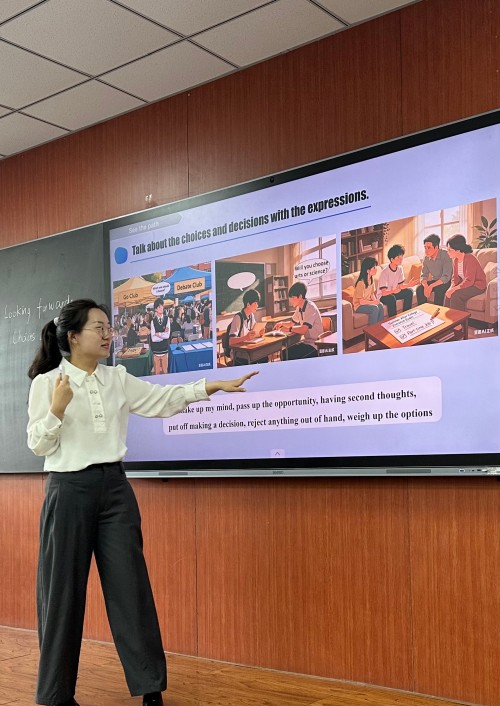 第二环节,在高二分会场,市教研员林红老师主持教研活动,由大连市第二十四中学杨浩鑫教师执教选择性必修第四册Unit 1“Looking Forward — Choices and Decisions”听说观摩课。本课围绕“个人职业倾向与未来规划”主题,以结构化问题链为驱动,完整落实深度学习闭环。从问题设计到活动组织,再到价值引领,环节紧凑、节奏合理,体现出教师专业能力的全面成长。